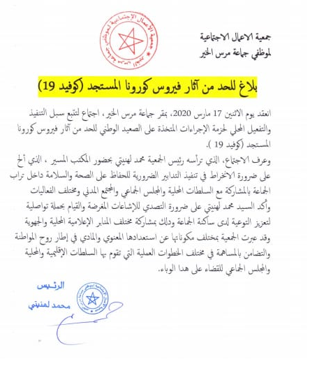 Une contribution de l’Association des œuvres sociales des fonctionnaires de la commune Mers El Kheir au Fonds spécial dédié à la gestion de la pandémie du Coronavirus (Covid-19), mis en place sur hautes instructions du Roi Mohammed VI, avec avec une participation de 5000 DH, exprimant ainsi les valeurs de solidarité et de citoyenneté qui caractérisent notre pays.