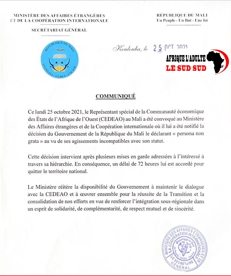 «Ce lundi 25 octobre 2021, le représentant spécial de la de la Communauté Economique des Etats de l’Afrique de l’Ouest (CEDEAO) au Mali a été convoqué au Ministère des Affaires étrangères et de la Coopération Internationale où il lui a été notifié la décision du gouvernement de la République du Mali le déclarant [persona non grata] au vu de ses agissements incompatibles avec son statut», annonce le communiqué du ministère consulté par l’Agence Anadolu.