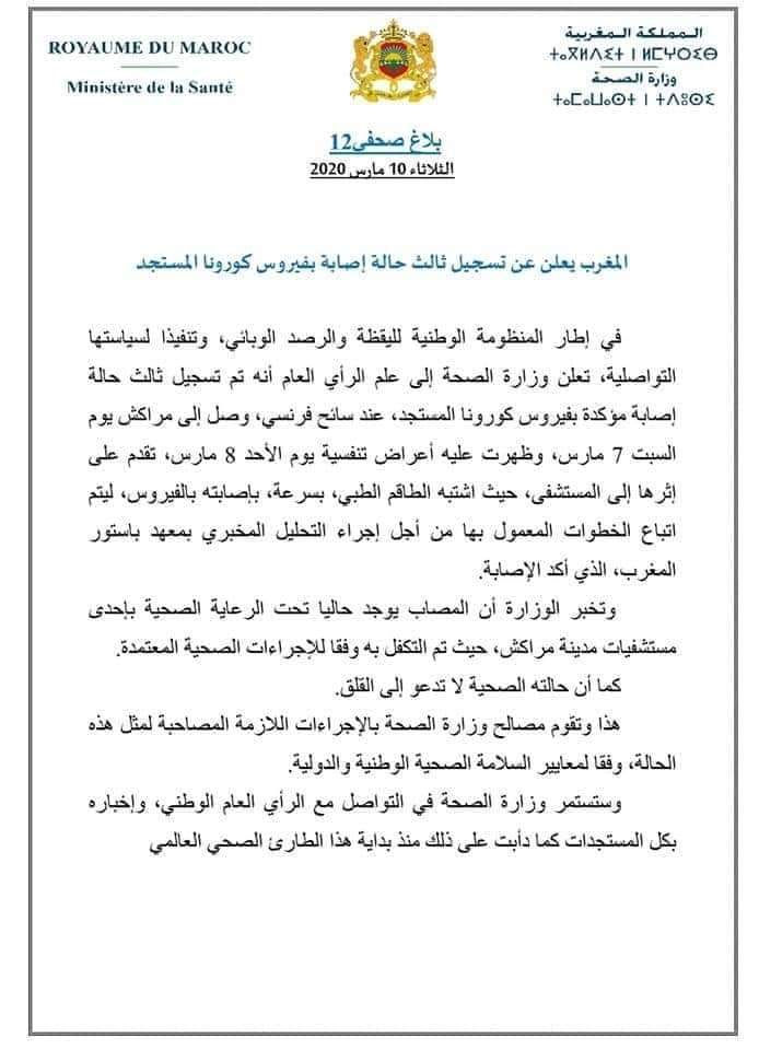 تسجيل ثالث إصابة بفيروس #كورونا_المستجد ب #المغرب عند سائح فرنسي وصل مدينة مراكش يوم السبت الأخير pic.twitter.com/BxQ8y8ET7B — سعد الدين العثماني EL OTMANI Saad dine (@Elotmanisaad) March 10, 2020