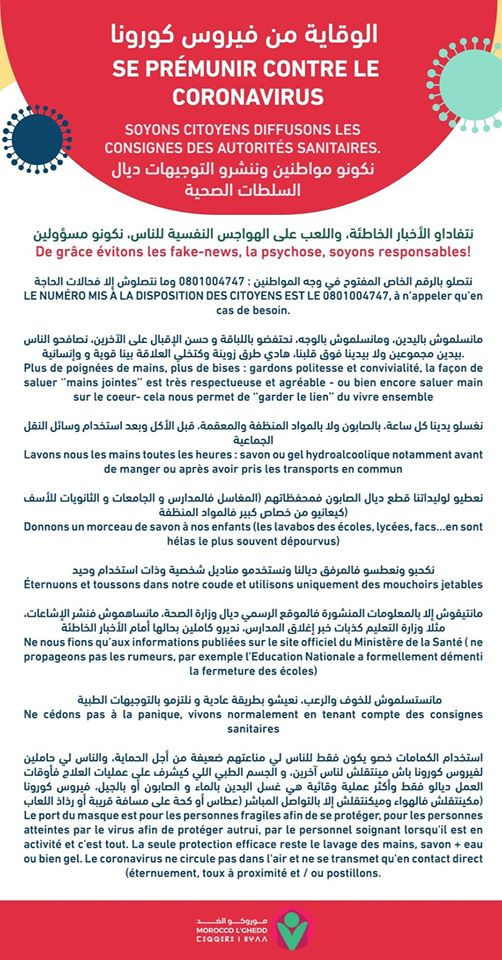 Le communiqué: “Dans le cadre du dispositif de veille et de surveillance épidémiologique et en exécution de sa politique de communication, le ministère de la Santé annonce à l’opinion publique qu’un troisième cas du nouveau coronavirus a été enregistré et confirmé d’un touriste français, arrivé samedi à Marrakech et qui présentait dimanche des symptômes respiratoires, indique le ministère dans un communiqué, précisant que le patient s’est rendu à l’hôpital et que le corps médical, qui a soupçonné rapidement son infection, a entamé les étapes nécessaires pour effectuer les analyses au laboratoire de l’Institut Pasteur-Maroc, ayant confirmé le cas.