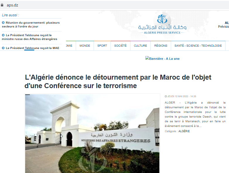 Dans une déclaration officielle publiée ce jeudi 12 mai par le ministère algérien des Affaires étrangères, l’APS (agence officielle algérienne) rapporte que «l’Algérie a dénoncé le détournement par le Maroc de l’objet de la Conférence internationale pour la lutte contre le groupe terroriste Daech, qui vient de se tenir à Marrakech, pour en faire un évènement consacré à la question du Sahara occidental».